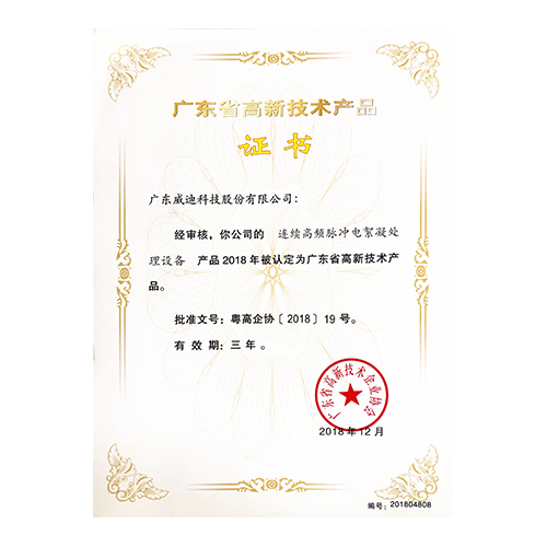 2018年廣東省高新技術產品-連續高頻脈沖電絮凝處理設備