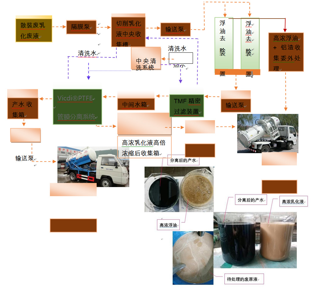 威迪使用自主研發的TMF管式微濾膜系統+納濾系統處理技術,克服了傳統乳化廢液處理工藝的缺點,為客戶提供高效、可靠地乳化廢液解決方案。