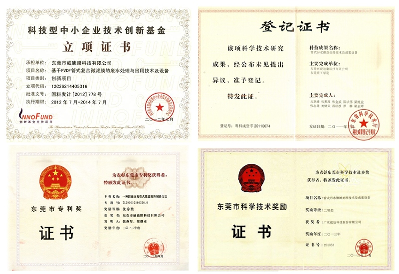 課題組自2006年開始進行基于管式微濾膜的污水處理技術研究與應用工作,分別完成了2006年東莞市創新基金項目《管式膜法廢水深度處理技術與成套設備》、2011年的東莞市科技型中小企業技術創新資金項目(201120110116)和2012年國家科技型中小企業技術創新基金無償資助項目(12C26214405316)《基于PVDF管式復合微濾膜的廢水處理與回用技術及設備》以及2013年度東莞市產學研合作項目《電鍍廢水膜法回用的電化學預處理關鍵技術研究》(201350910800625),2009年的國家自然科學基金項目《往復旋轉中空纖維膜剪切強化機理與滲透特性研究》(20906014)等項目。這期間獲得了19項發明專利、25項實用新型專利,發表相關論文24篇,獲得6項廣東省高新技術產品,1項東莞市科技進步二等獎,1項東莞市專利獎。目前該項目產品已經成功應用于36個較大型的廢水處理工程中。