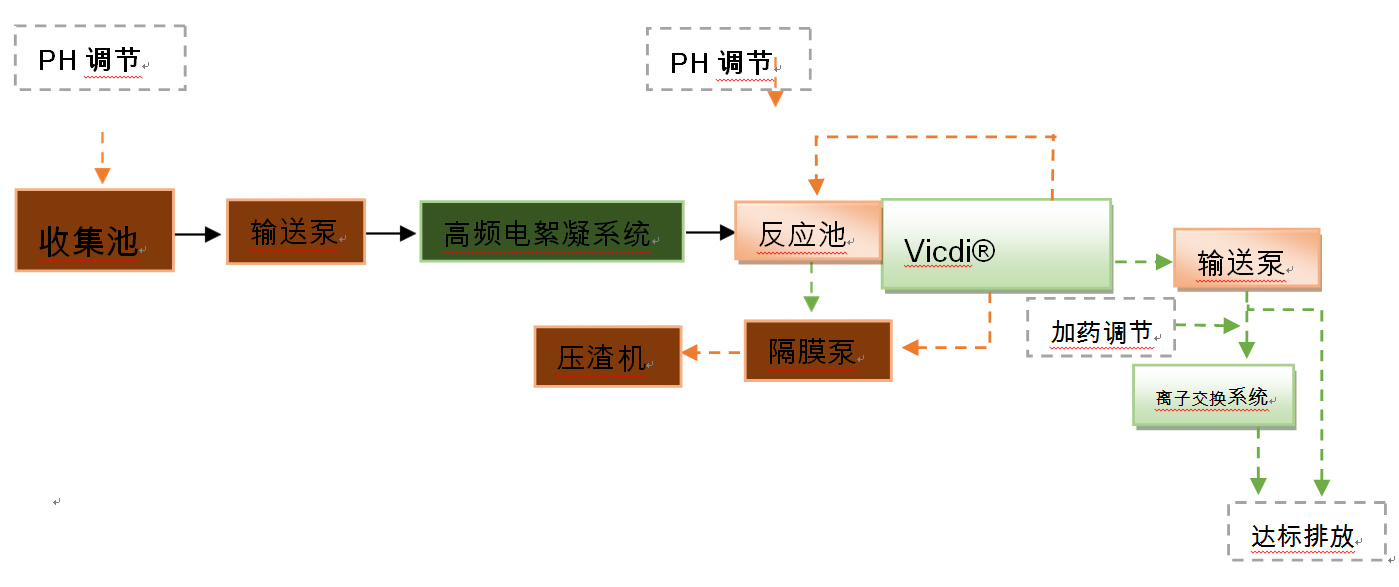 生產中產生的含鎳含鉻廢水收集至收費池,調節 pH 值,進入高頻脈沖電絮凝系統,廢水被電離 分解后,再調節 PH 值,進入ⅴicdi MBR 固液分離系統,污泥經壓渣機固化后委外處理。產水調節 pH 值,檢測水質達標即可直接排放。若水質仍然超標,進入離子交換系統,確保水質達標排放。