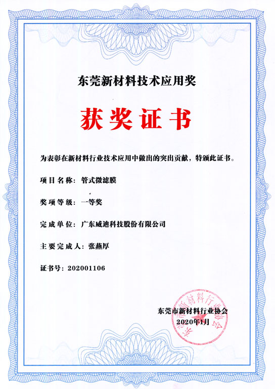 本次活動是由清華東莞創新中心、東莞理工學院科技處主辦,東莞市新材料行業協會承辦,廣東清大孵化器有限公司協辦。會上表彰了在新材料行業技術創新、應用、服務做出的突出貢獻的單位及個人。由廣東威迪科技股份有限公司申報的《管式微濾膜》項目榮獲東莞新材料技術應用獎(項目類)一等獎。